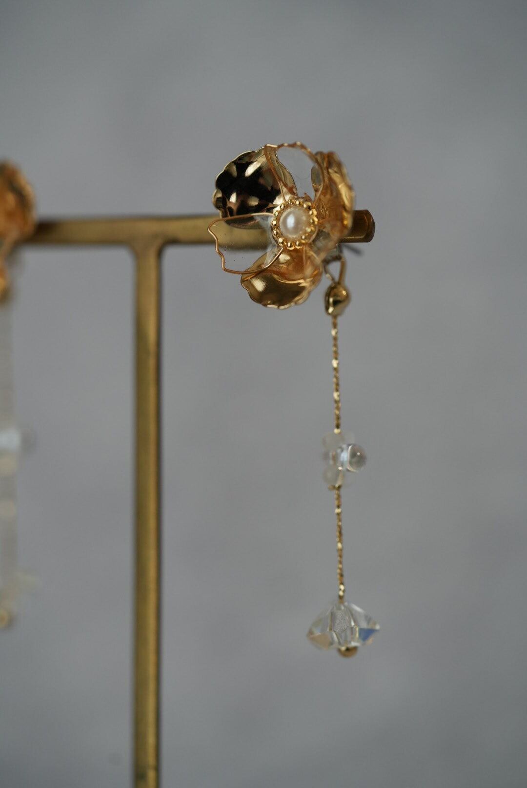 ゴールドとクリアの花びらで 大人の抜け感を。 ひとつひとつワイヤーを曲げて作った クリアの花びらは世界に一つだけのlumiange オリジナルのパーツです。 子どもっぽくなく、上品に。 そんなデザインを思い浮かべながら ワイヤーを曲げる日々・・・ 納得のいく形が仕上がるまでに 時間がかかりましたが、 大満足のデザインが完成しました。 チェーン部分のうるっとしたビーズも 動くたびにキラキラ輝きかわいいです♡ ✔︎pierce...ステンレス ✔︎earring...真鍮